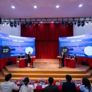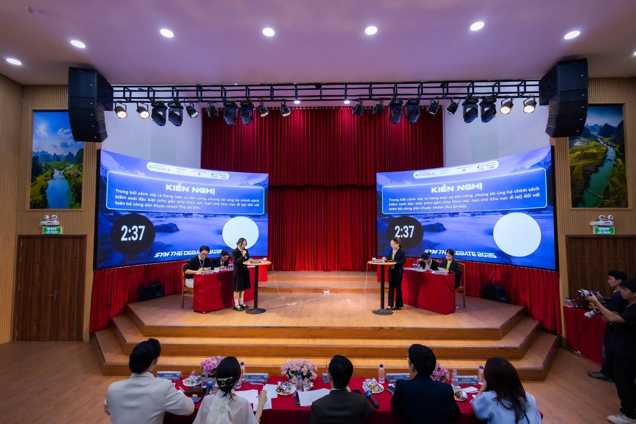 Bên cạnh đó, anh Đỗ Ngọc Quốc Thông – Founder & CEO Học viện Đào tạo Tư duy Mình Du Mục, Founder Vietnam Public Speaking Community, anh Đinh Khánh Duy – Trưởng ban chuyên môn Giải Tranh biện “Vietnam Youth Debate Tournament 2023”, và chị Lê Nguyệt Minh – Top 5 Giám khảo xuất sắc nhất Giải Tranh biện Trung học Toàn quốc (NSDC) 2025 đã cùng thống nhất đưa ra những đánh giá công tâm, bám sát năng lực thể hiện thực tế của từng đội thi.