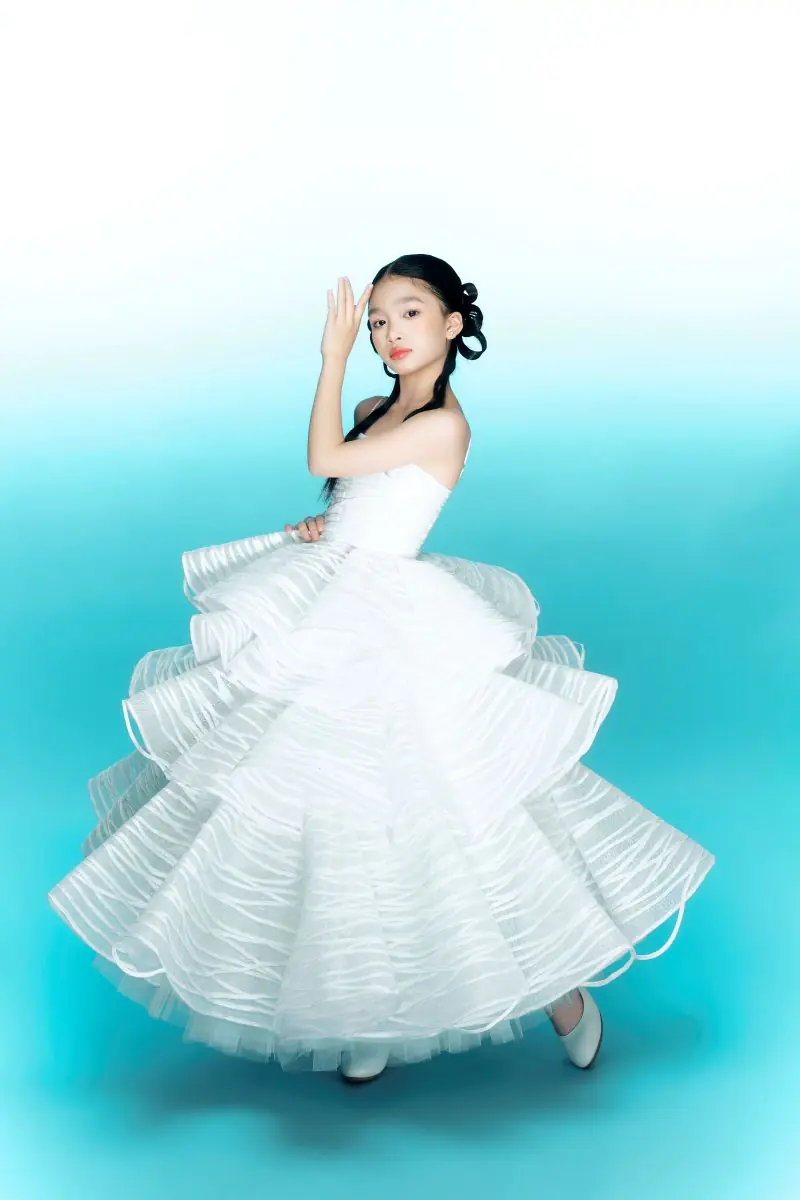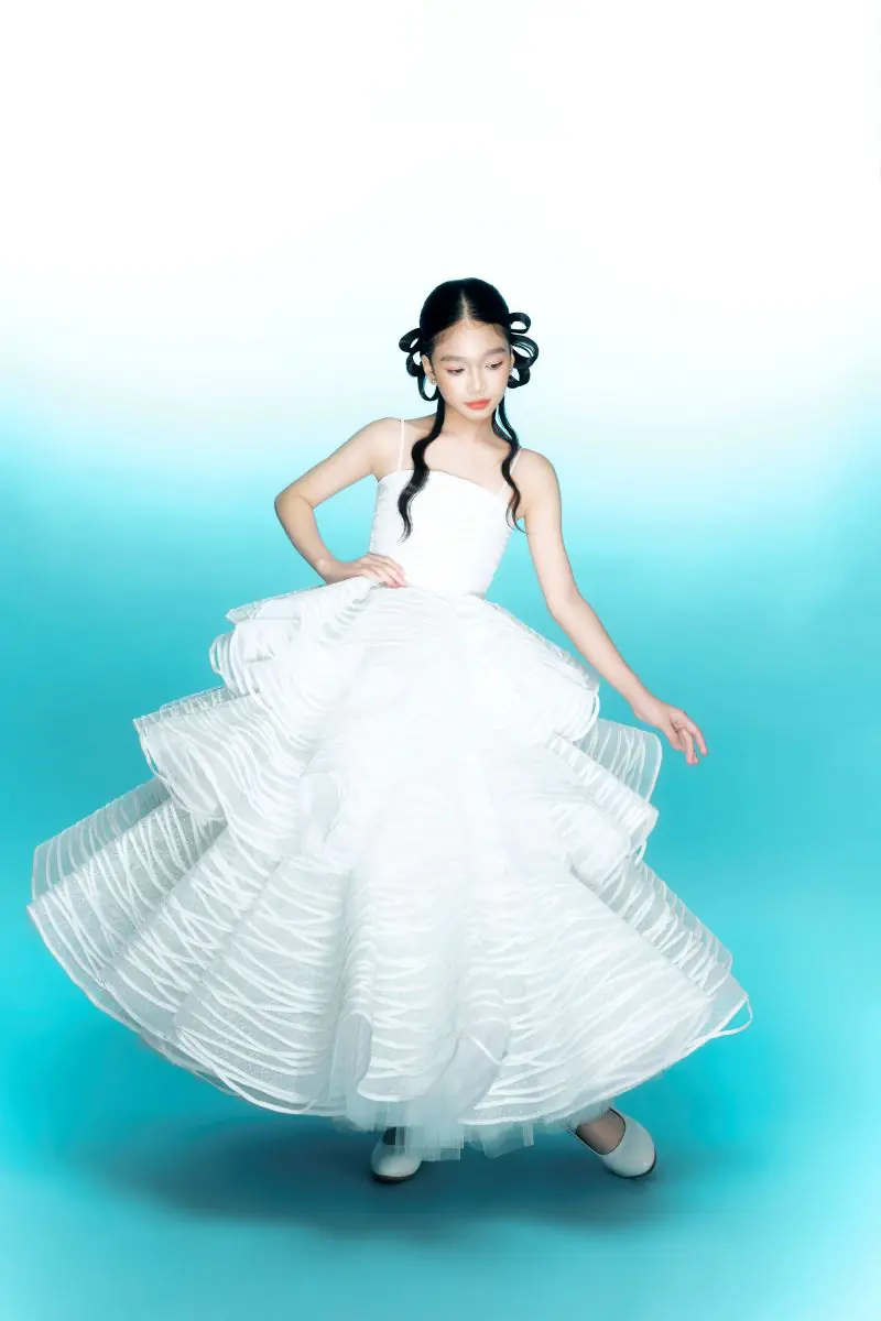 Ở thiết kế bánh rế, tinh thần lại chuyển sang hướng thanh khiết và tinh giản. Váy được thực hiện với tông trắng trong, trắng sữa pha ánh ngọc tạo cảm giác nhẹ, thoáng và tinh khôi. Phom váy xếp tầng mềm mại, bề mặt vải xử lý vân gợn mảnh gợi hình những sợi bánh rế mỏng, giòn, đan đều tay. Không phô trương màu sắc, thiết kế này chinh phục người xem bằng kỹ thuật xử lý chất liệu và sự uyển chuyển trong từng chuyển động giúp Ruby Tâm Nhi giữ trọn vẻ trong trẻo đúng lứa tuổi.