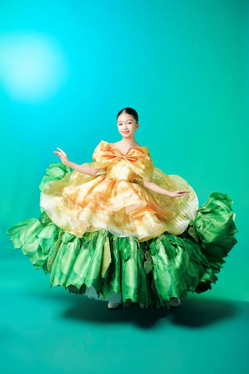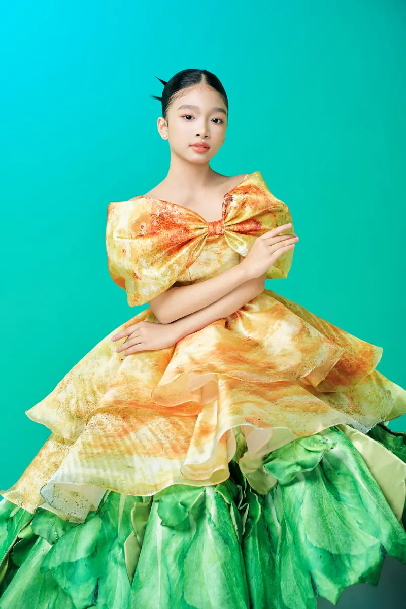 Thiết kế bánh xèo gây ấn tượng mạnh bởi bảng màu vàng nghệ, vàng nâu hòa quyện cùng sắc xanh lá. NTK xử lý bề mặt váy như những mảng màu loang tự nhiên, gợi liên tưởng đến lớp bánh xèo vừa đổ khuôn, còn nóng hổi. Phần vai trễ kết hợp chi tiết nơ lớn bản rộng tạo điểm nhấn mềm mại, trong khi chân váy bung nở nhiều lớp xanh lá phía dưới như hình ảnh chiếc bánh đặt trên nền lá – một chi tiết quen thuộc trong ẩm thực Nam Bộ. Tổng thể trang phục vừa gần gũi vừa mang tính trình diễn cao nhưng vẫn giữ được sự nhẹ nhàng cần thiết cho mẫu nhí.