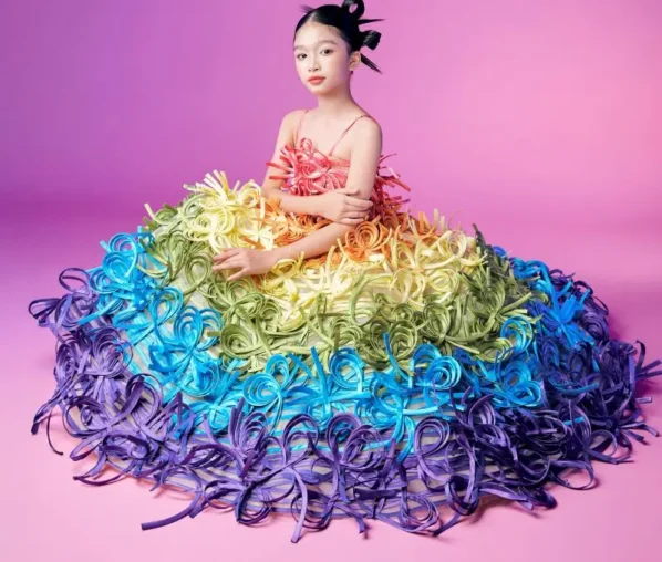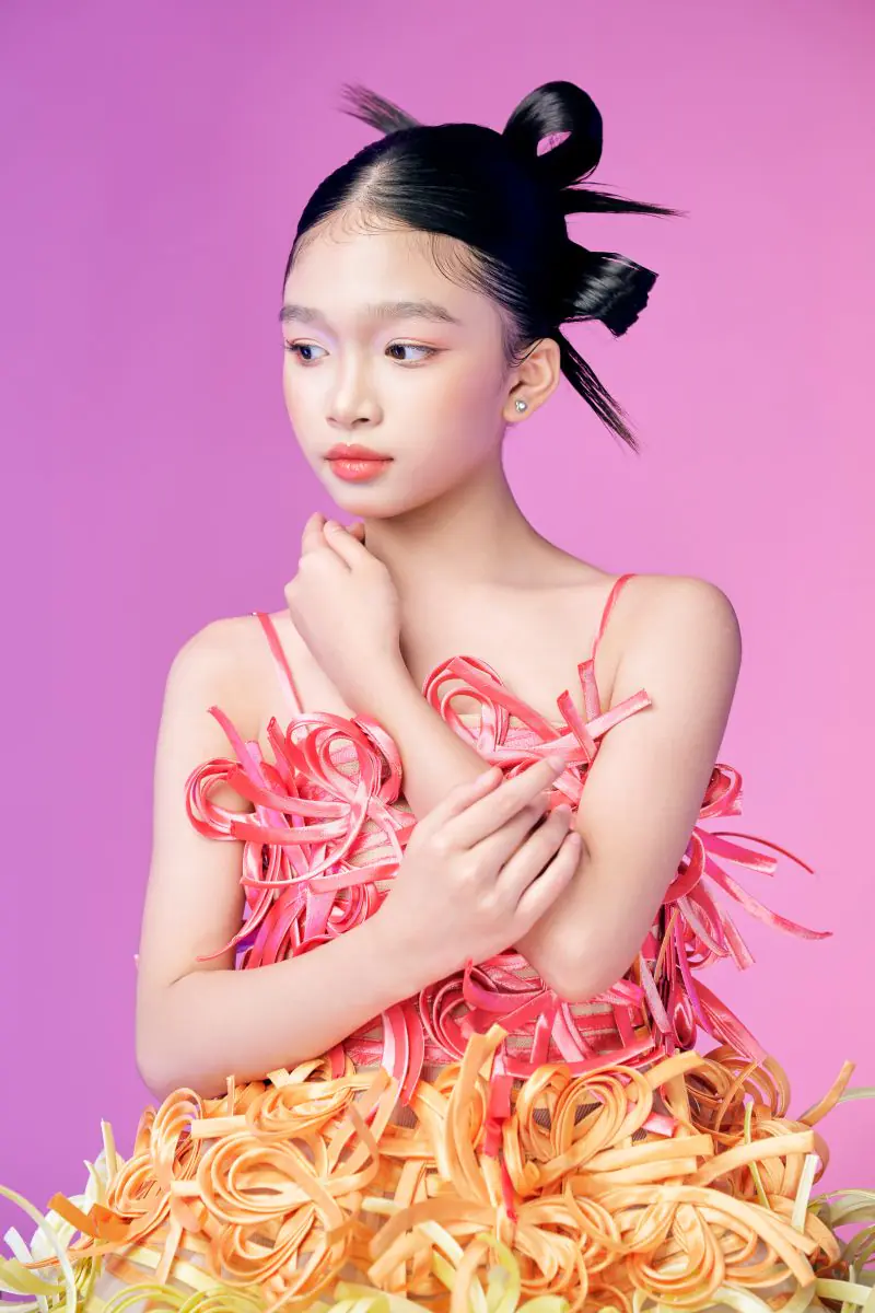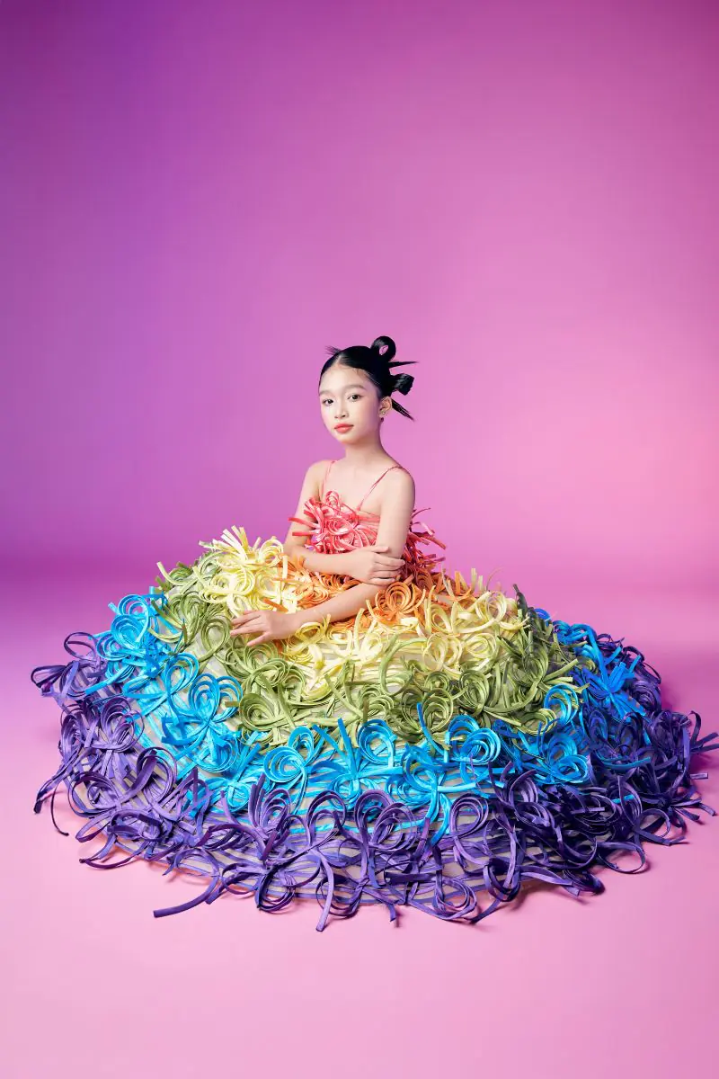 Trái ngược với sự tiết chế của bánh rế, thiết kế mứt dừa là điểm nhấn thị giác mạnh nhất trong bộ ảnh. Váy được xử lý cầu kỳ với kỹ thuật cuộn, xoắn, xếp lớp dày, tạo nên hiệu ứng chuyển tầng đa sắc từ tím, xanh, xanh lá, vàng đến cam, hồng. Tổng thể gợi liên tưởng đến mâm mứt dừa ngũ sắc ngày Tết rực rỡ, vui tươi và tràn đầy không khí lễ hội. Dù có phom đại xòe và nhiều chi tiết, phần thân trên vẫn được tiết chế gọn gàng để đảm bảo sự cân đối, giúp mẫu nhí di chuyển linh hoạt trên sàn diễn.